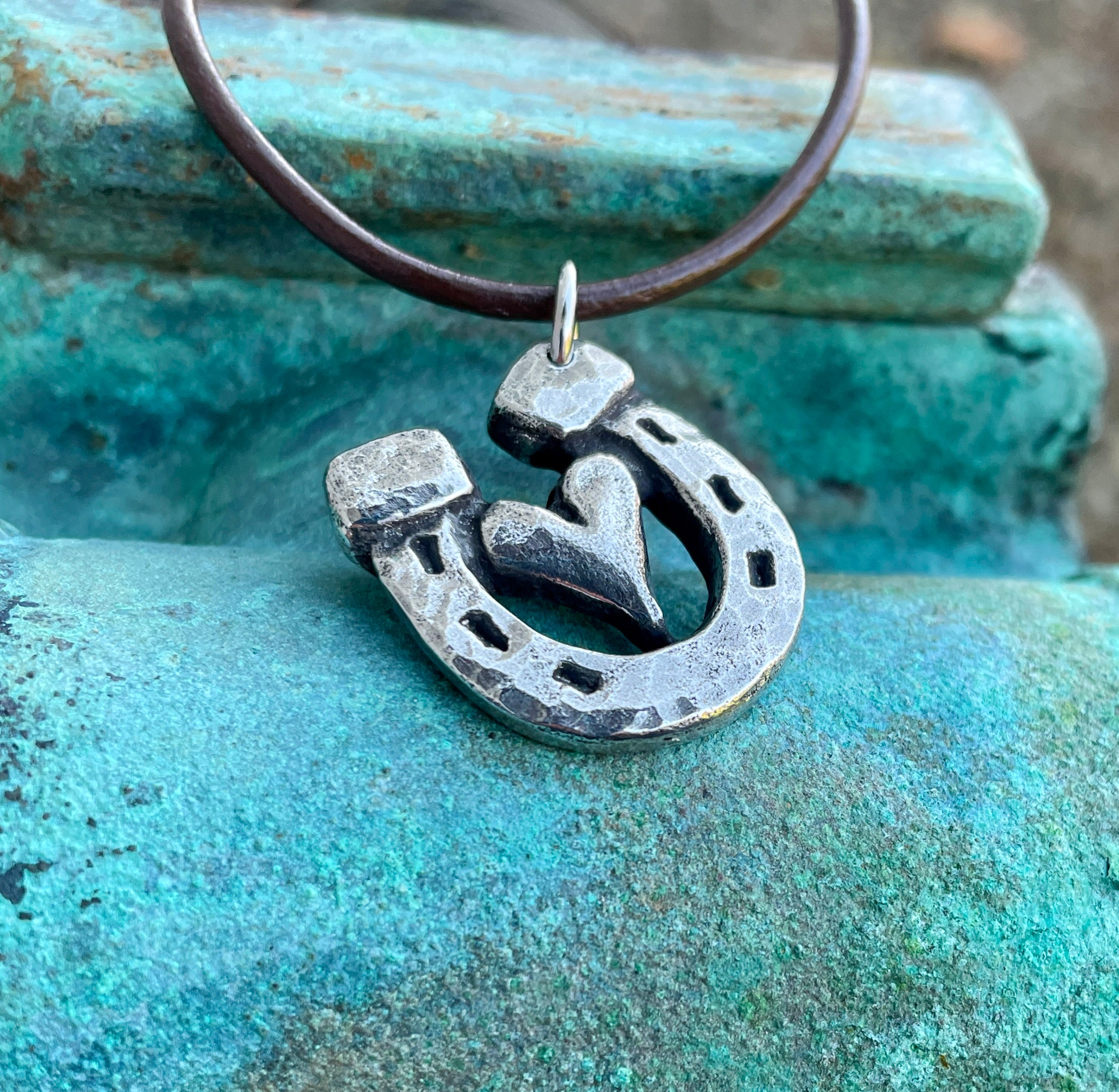Heart in Horseshoe pendant was cast in fine pewter. It has an hand hammered texture on horseshoe and has been oxidized and polished. Size is 7/8 of an inch wide and 1 inch tall. Shown strung on a brown 18 inch leather cord with lobster clasp. Pendant is available without the cord, please use drop down menu.