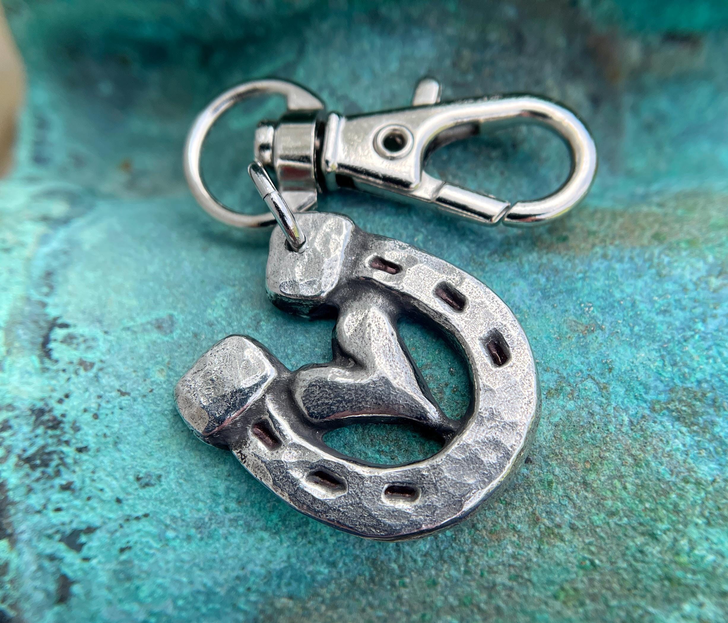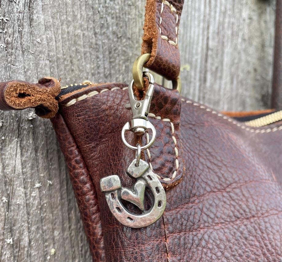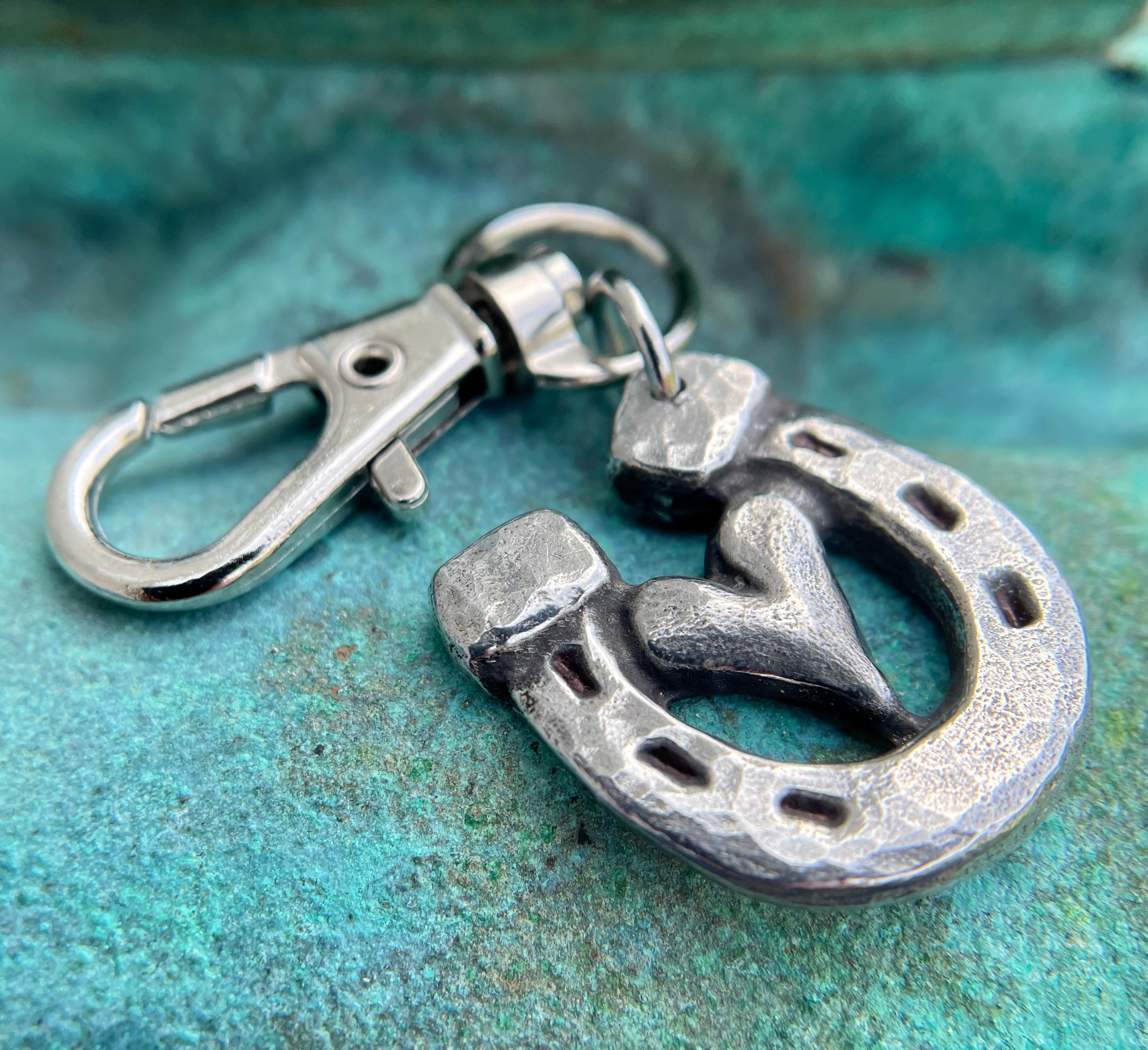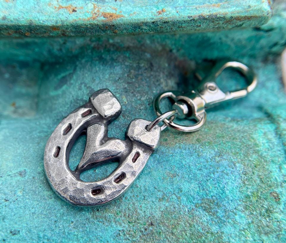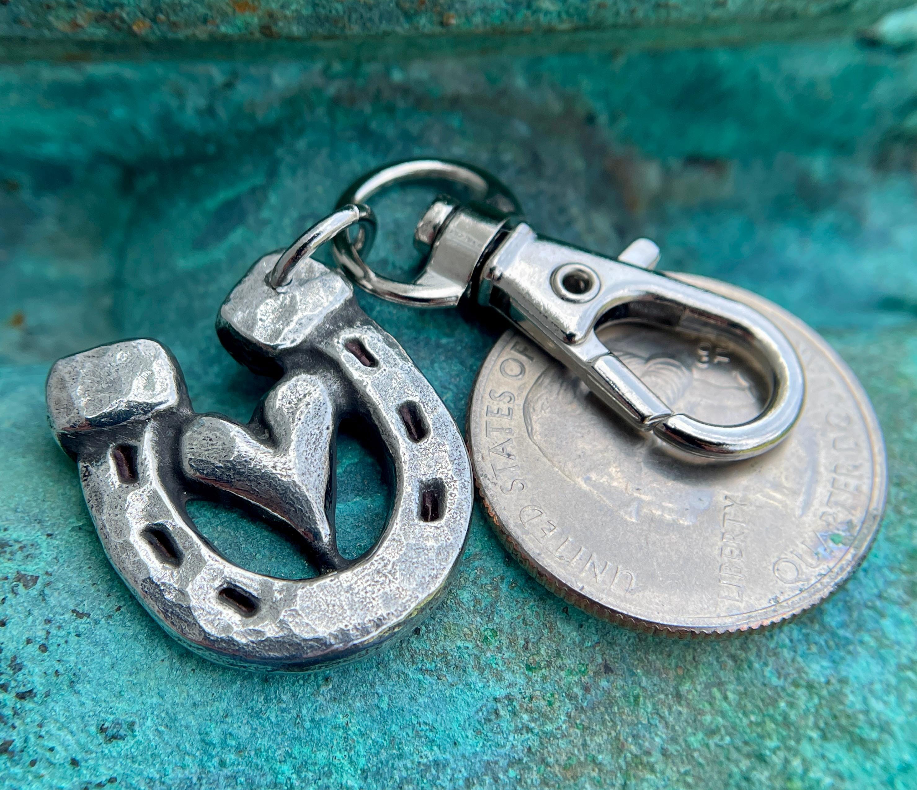 Horse Shoe Heart Purse Charm. Hand cast in fine pewter. Hand hammered texture on the horse shoe It has an oxidized and polished finish. The heart is 1 inch tall and almost 1 inch wide. Attached to a Large Lobster Clip with strong stainless steel jump ring.