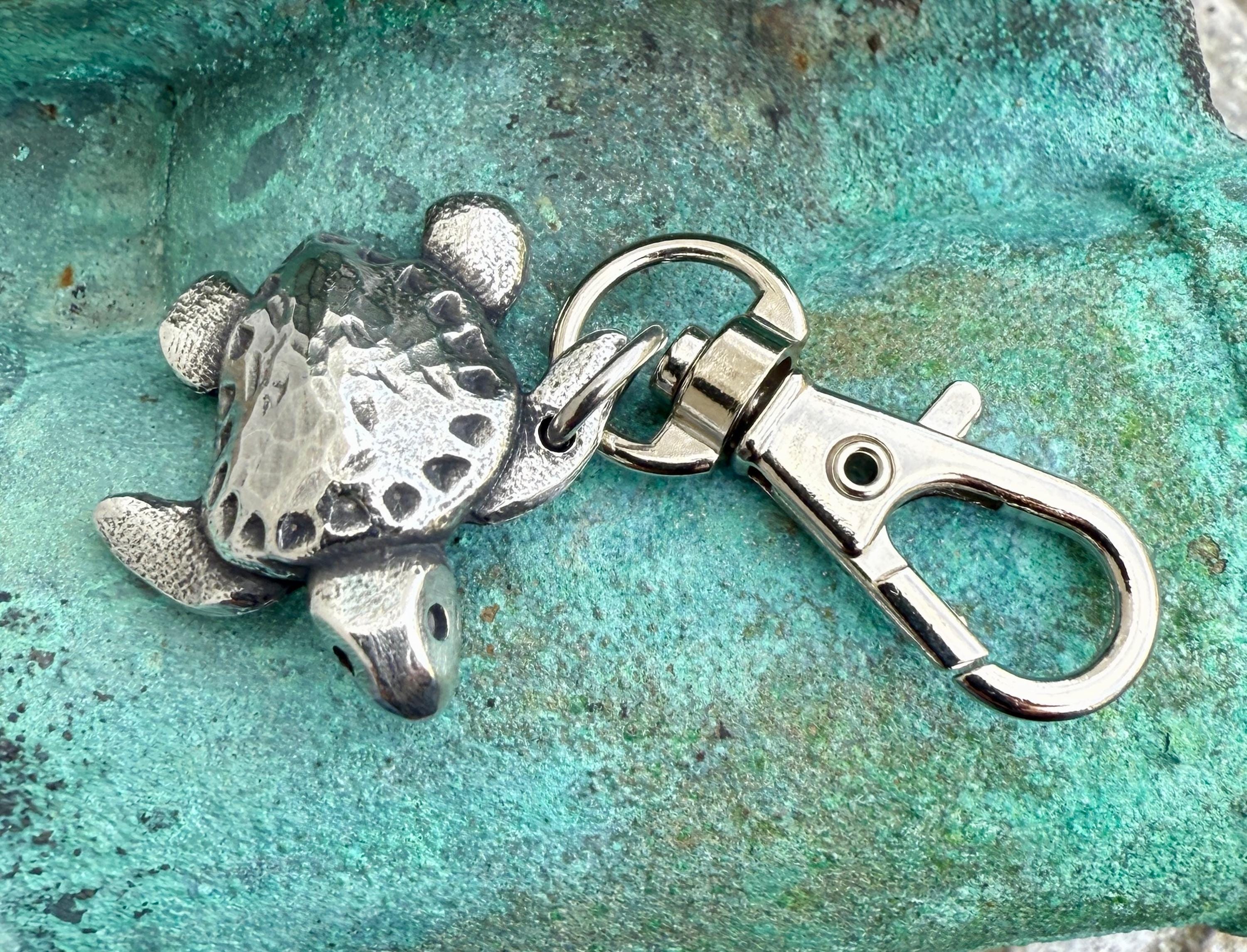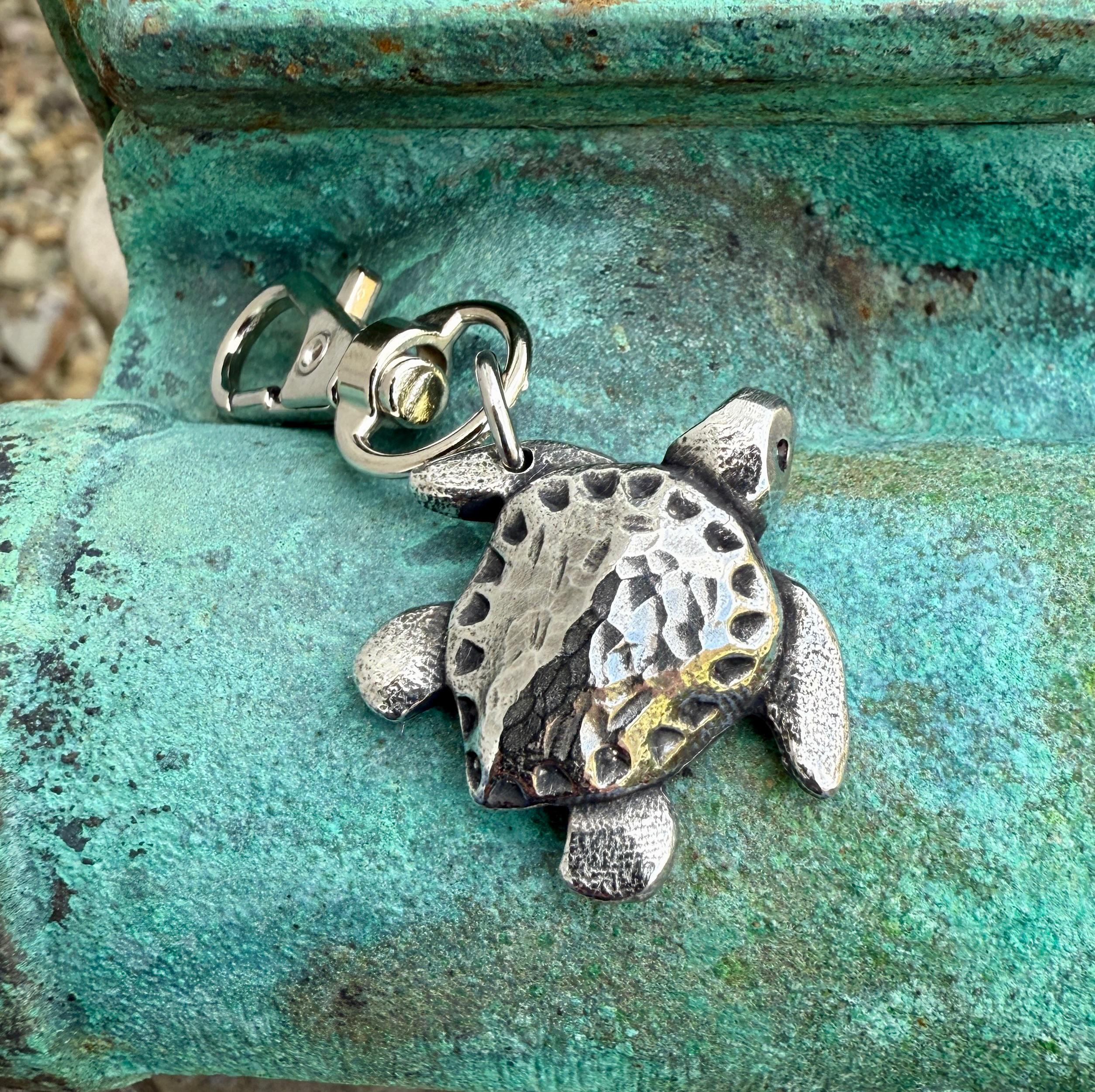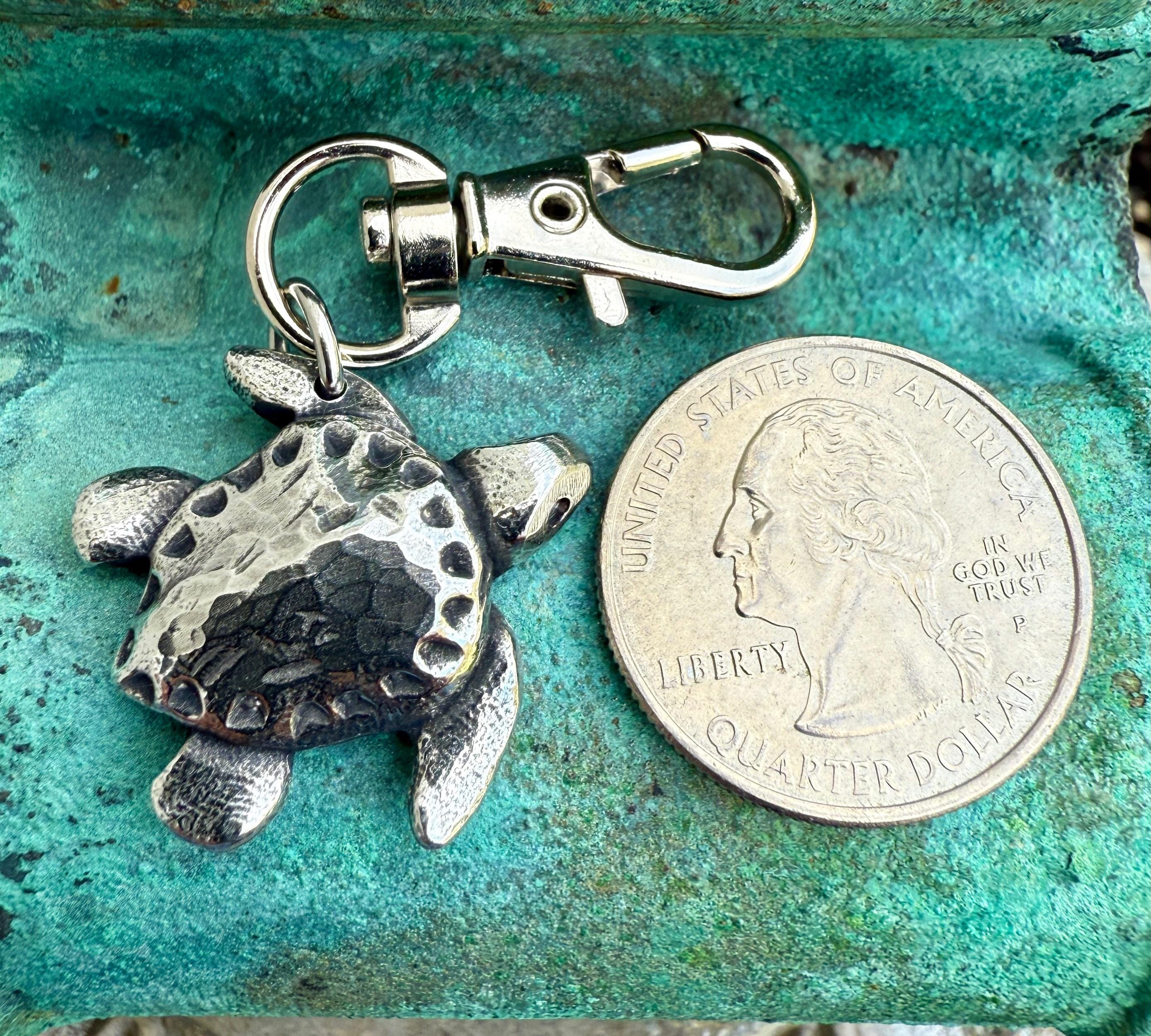 Sea Turtle Purse Charm. Hand cast fine pewter. Hand hammered texture on the turtles shell. It has an oxidized and polished finish. The Turtle is 1 inch tall and just 1 inch wide. Attached to a Large Lobster Clip with strong stainless steel jump ring.