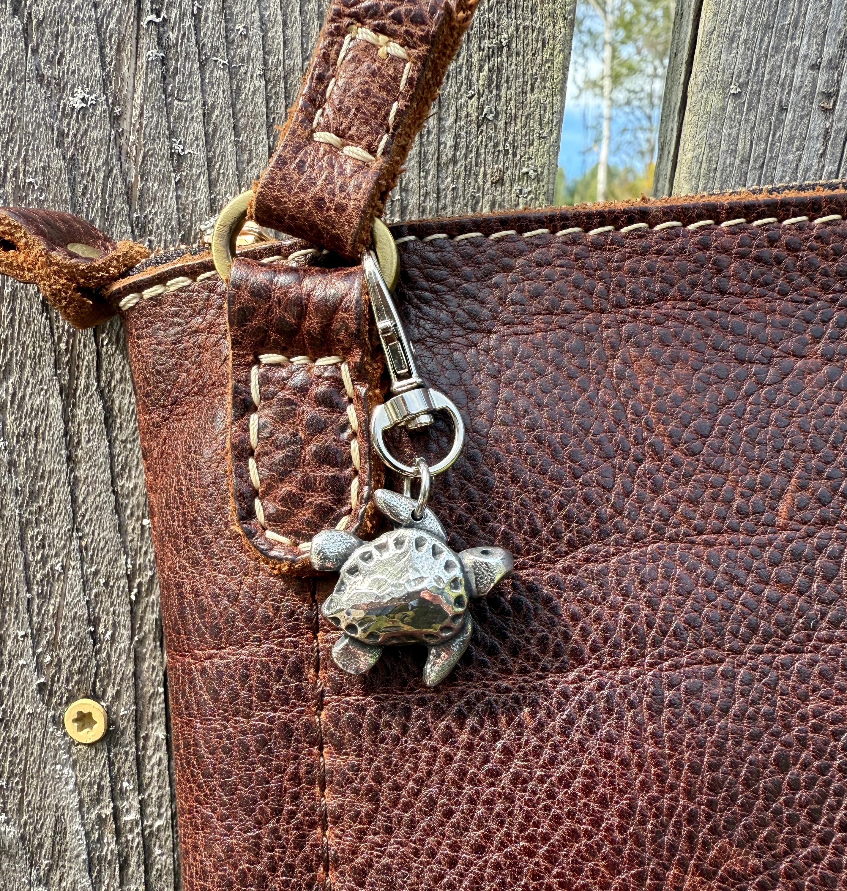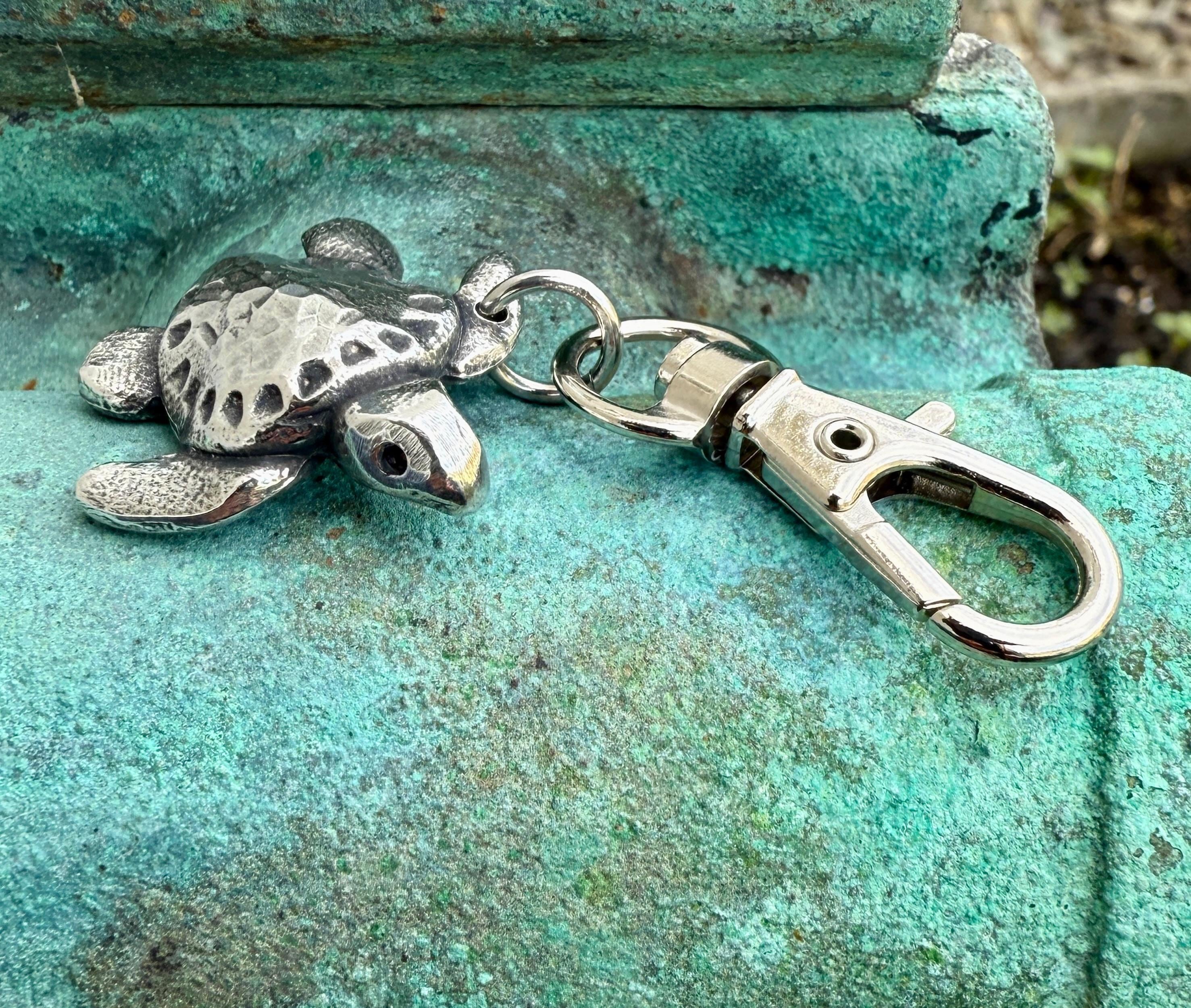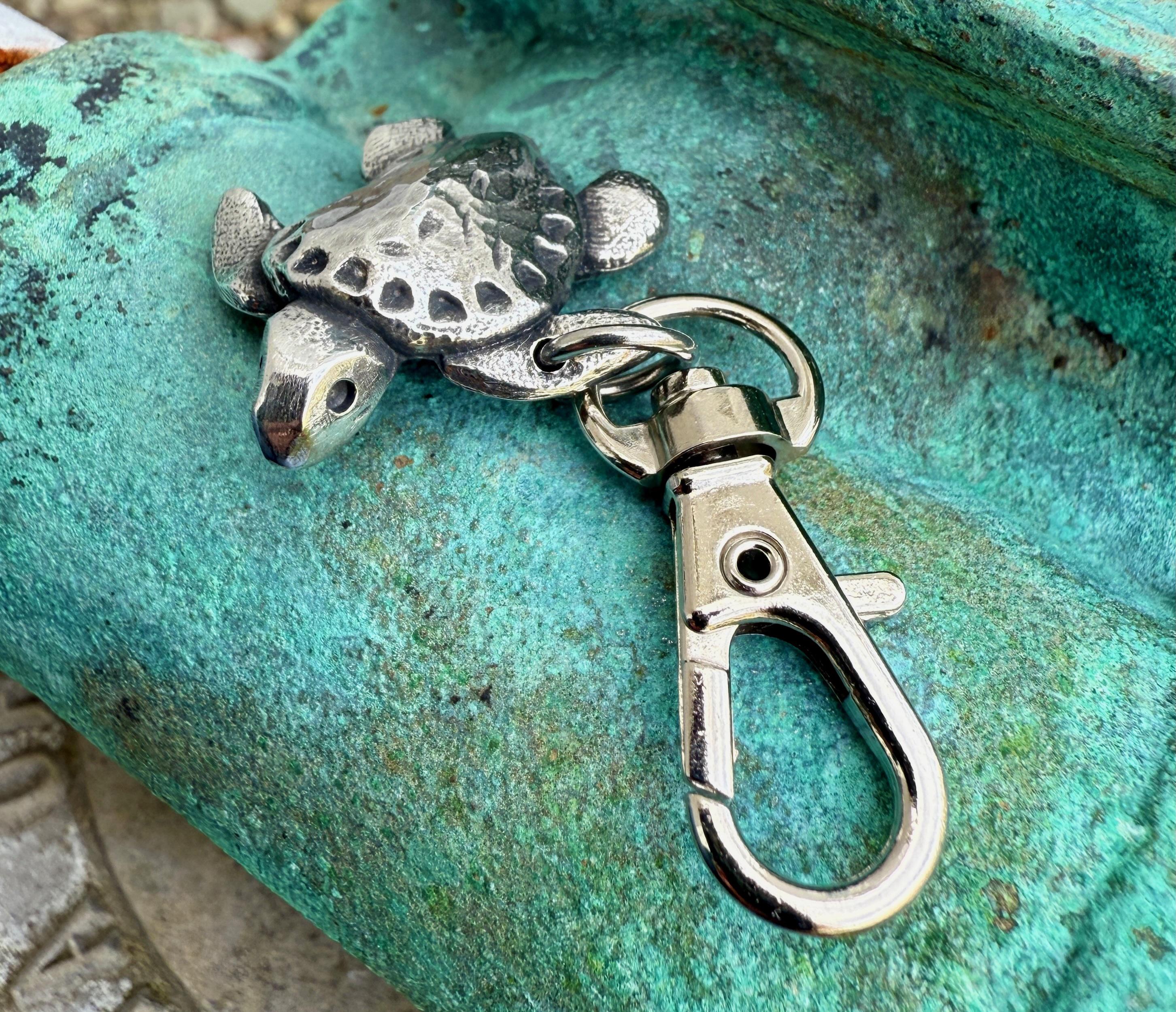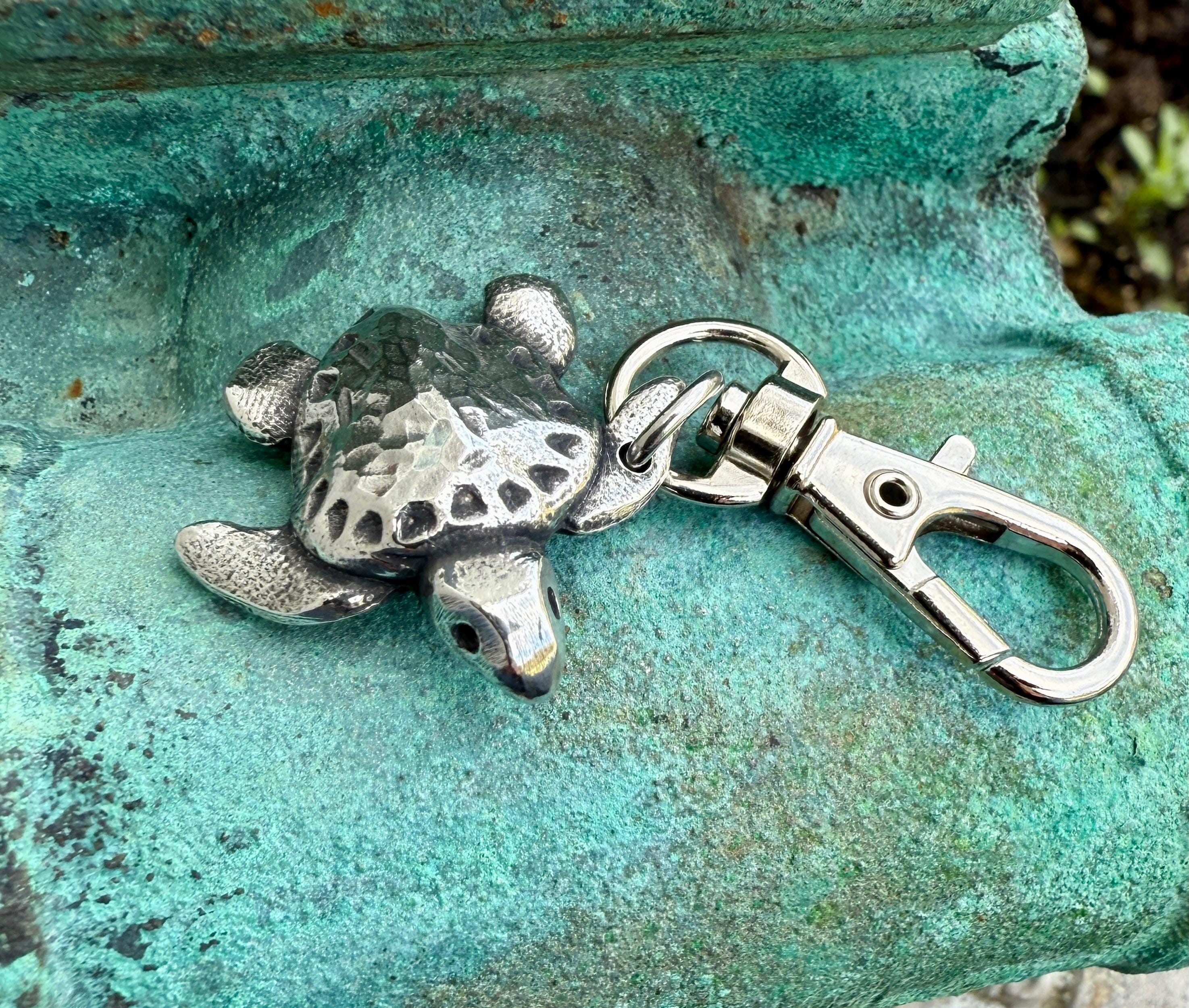 Sea Turtle Purse Charm. Hand cast fine pewter. Hand hammered texture on the turtles shell. It has an oxidized and polished finish. The Turtle is 1 inch tall and just 1 inch wide. Attached to a Large Lobster Clip with strong stainless steel jump ring.