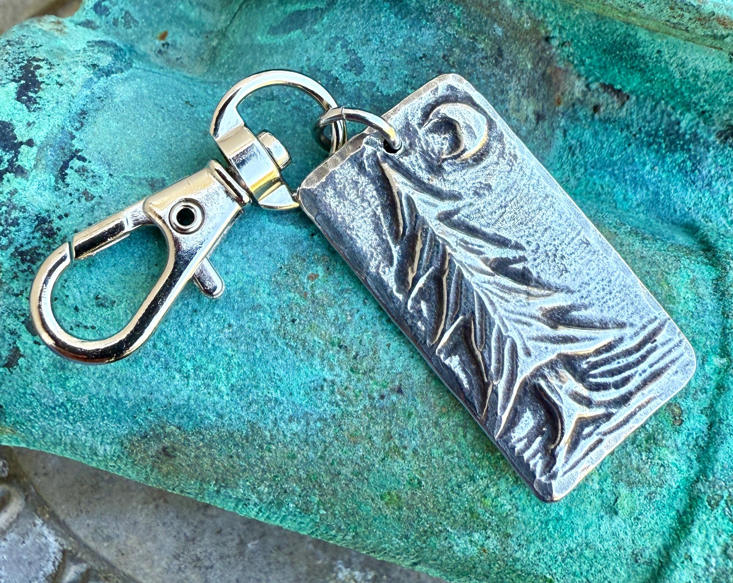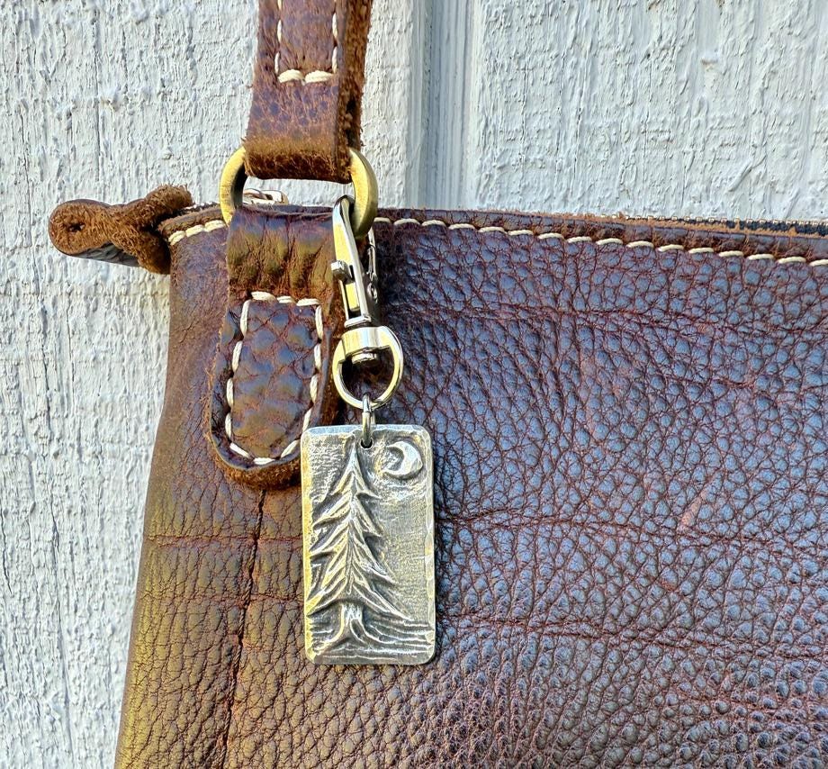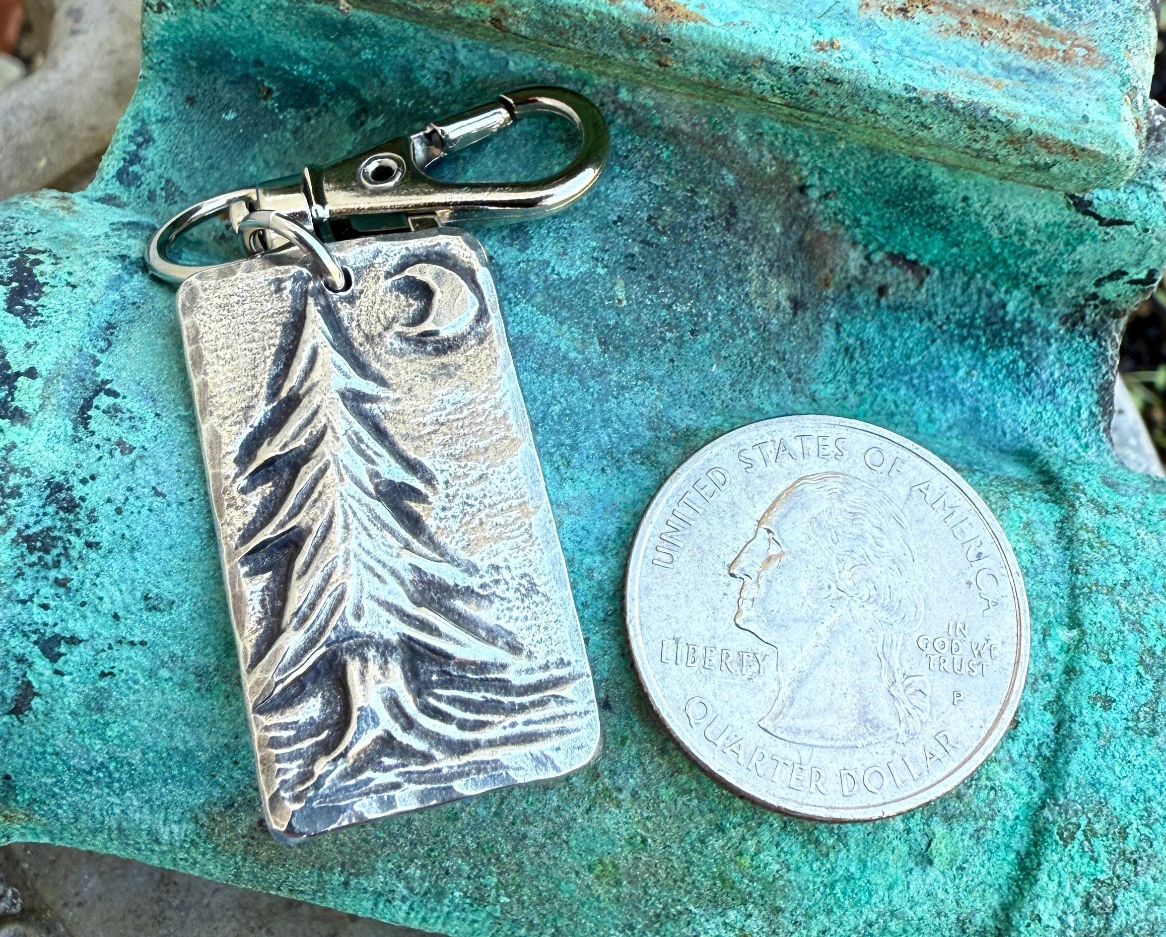 Pine Tree Purse Charm. Hand cast in fine pewter. Hand hammered texture on the tiny crescent moon and the edge. It has an oxidized and polished finish. Tree piece is 1 3/8 x 3/4 inch and is attached to the large lobster clasp with a strong stainless steel jump ring.
