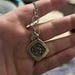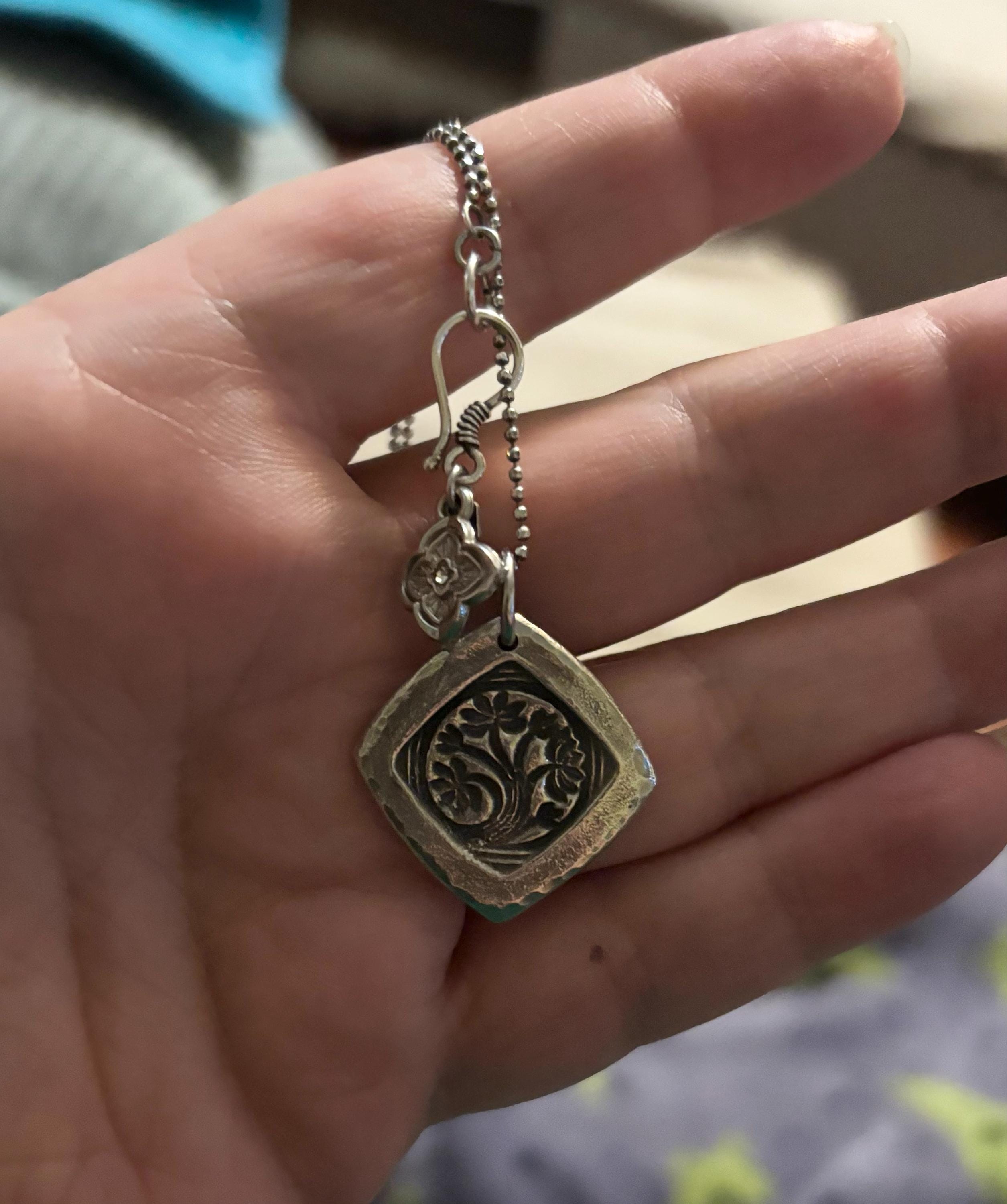 Hand cast in fine pewter. Size is 1 inch by 1 inch. Oxidized and polished finish. Hand hammered texture on the edge of the pendant. Shown strung on a brown 18 inch leather cord with lobster clasp. Pendant is available with or without the cord, please use drop down menu to choose.
