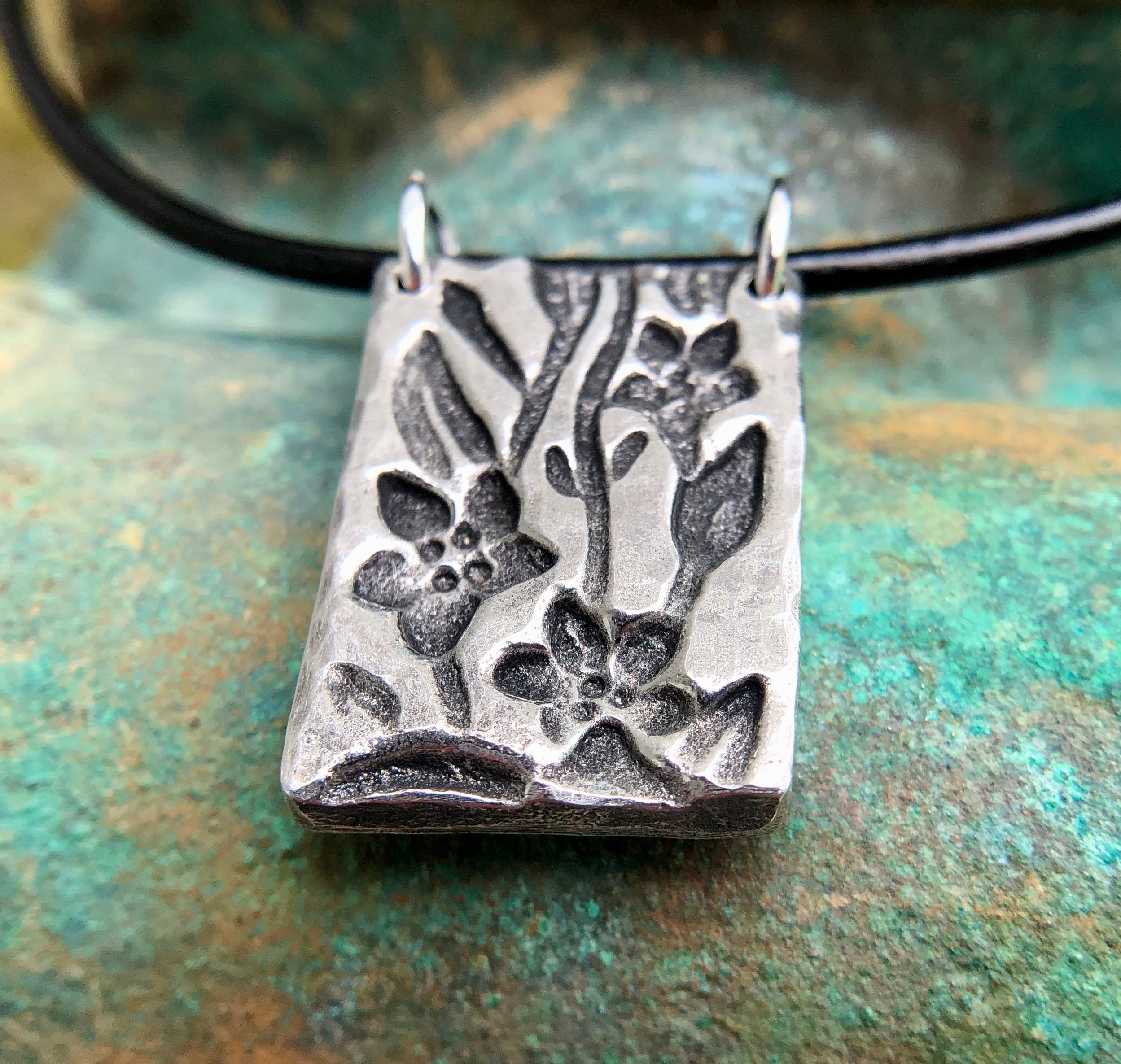 Cast by hand in fine pewter. The size is 3/4 inch wide by 1 inch tall. Hand hammered texture. Oxidized and polished finish. Shown strung on an 18 inch brown leather cord with lobster clasp. Pendant is available with or without the cord, please use drop down menu to choose either option.